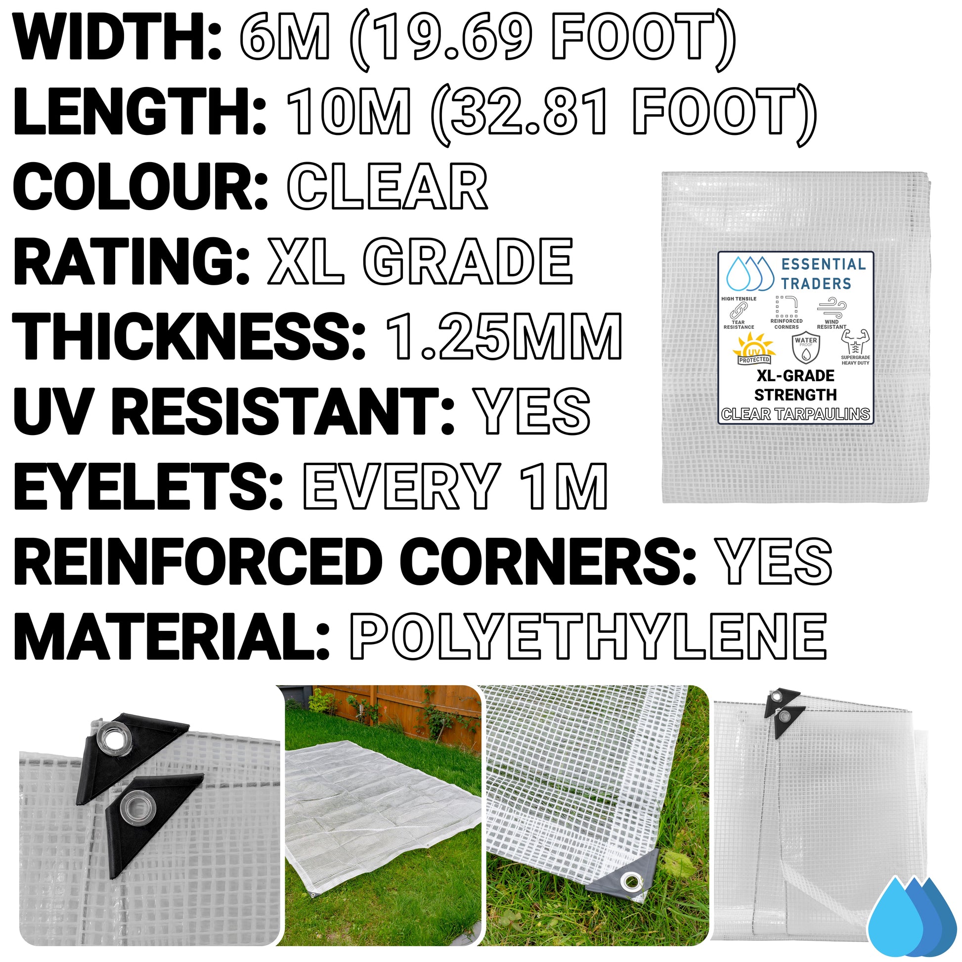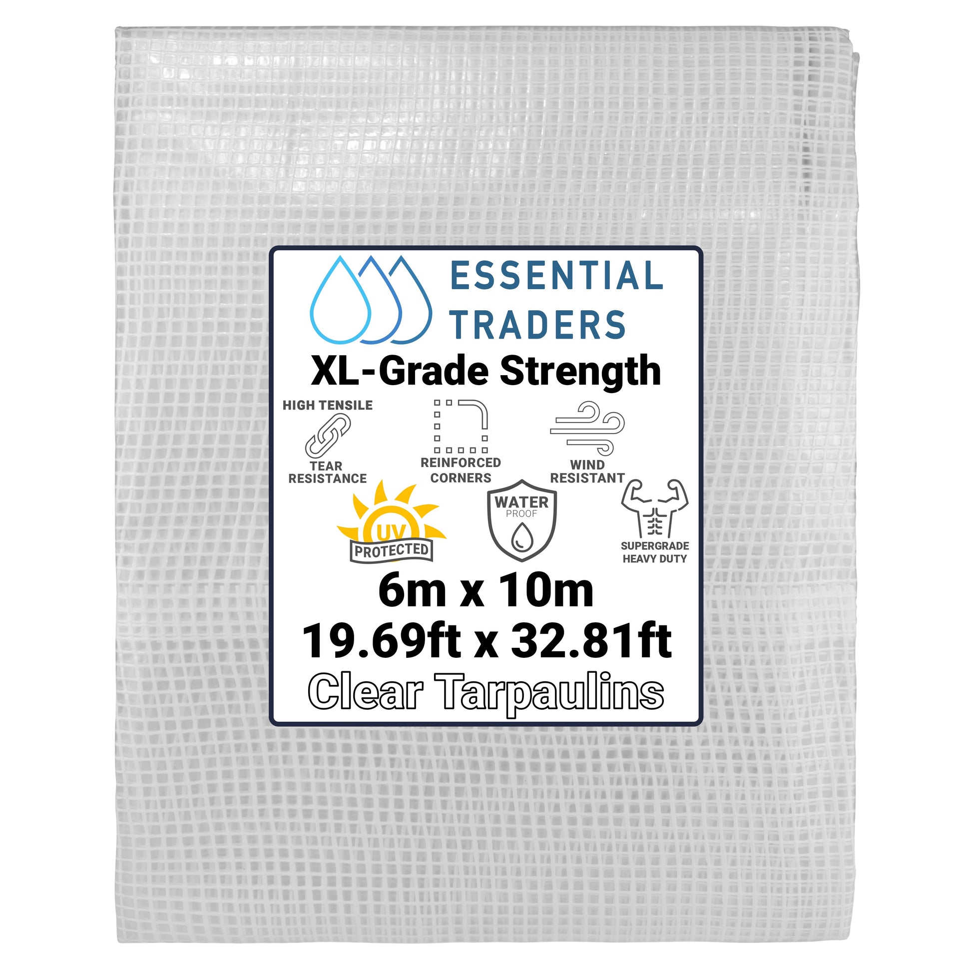 Our XL-Grade Strength 300gsm Clear Tarpaulins are the heaviest-duty option available, designed for very large applications. This tarpaulin measures 6m x 10m (19.69ft x 32.81ft), ideal for large spaces or projects requiring transparent, reinforced protection. Additional sizes are available in separate listings to meet your needs.