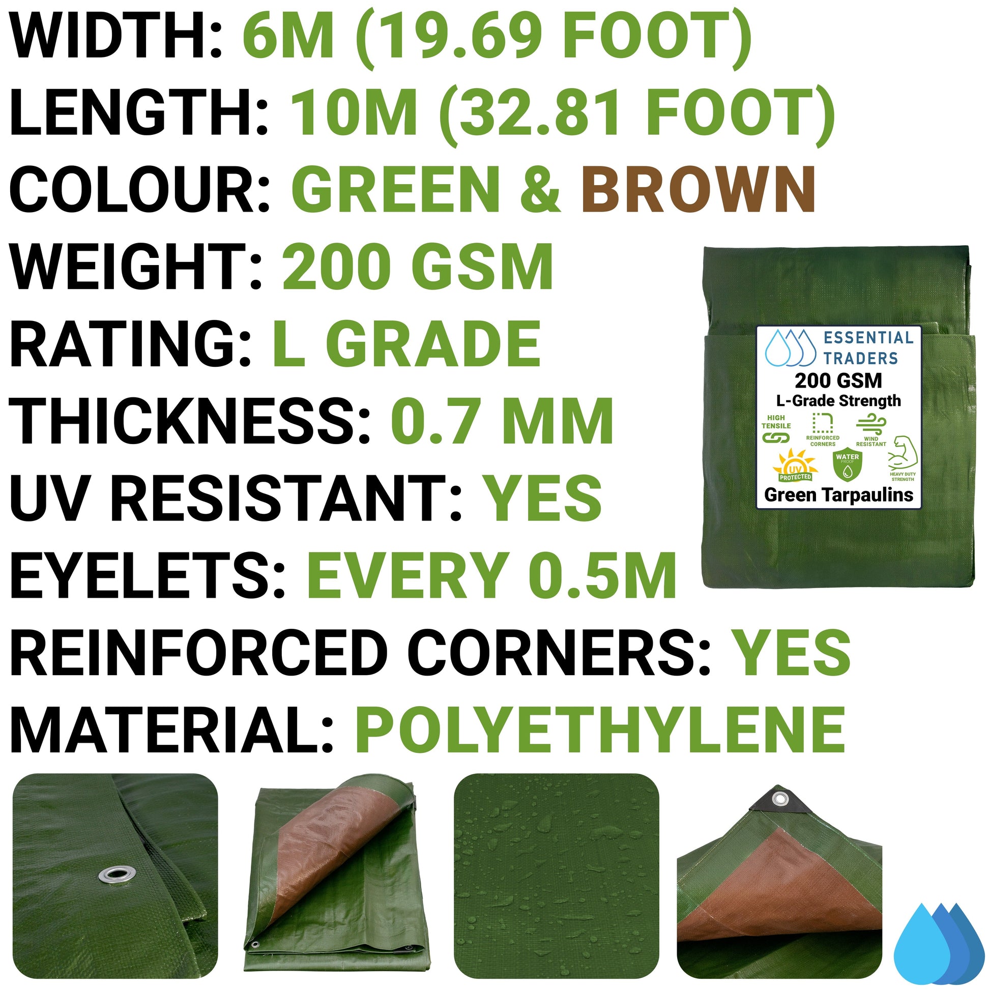 Heavy Duty 200gsm Green/Brown Tarpaulin – 6m x 10m